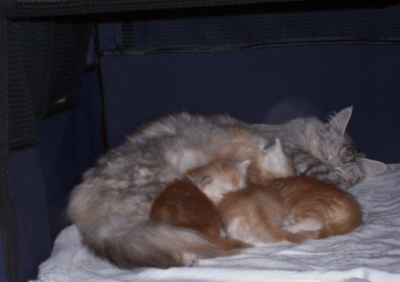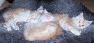 ... EveCoon Wurf Nr.: 4 am 03.06.2007 mit 4 Wochen. Alle folgenden Fotos mit 3 und 4 Wochen sind von Michael von den Metal Coons - vielen Dank dafür Michael. v.l.n.r. Rumpleteazer Ratzmataz Munglejerry