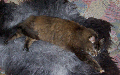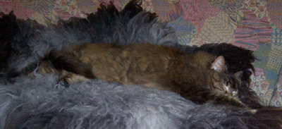 ... Tuckerli und der alte Schafsbock ... furchtbar teuer so ein großes Schaffell (hier aus artgerechter Haltung und schmerzfreier Tötung) - teuer, aber lecker warm und gut für die Knochen. Den offenbar gerade schmerzfreien Tucker im lieblichen Schlummer versunken, ist eines der schönsten Bilder, die ich mir vorstellen kann ...
