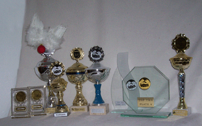 ... auf speziellen Wunsch eines einzelnen Michael (den wir erst einmal nicht weiter namentlich nennen) - hier also die Pokalsammlung vom Tuckerli ... Nein, nein, mehr sind es nicht - aber was für welche! Die absolute Kuriositäten- und Raritätensammlung!!! Wir haben viel Spaß daran, weil auch die Vereine und Richter viel Spaß an Tucker und an der Vergabe dieser Preise hatten. An dieser Stellen - meinen ganz herzlichen Dank an die Beteiligten, es war uns ein großes Vergnügen ... :-)))))