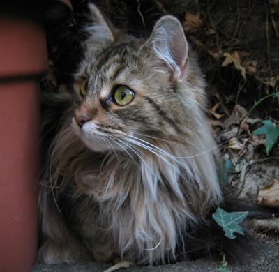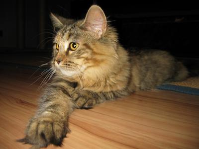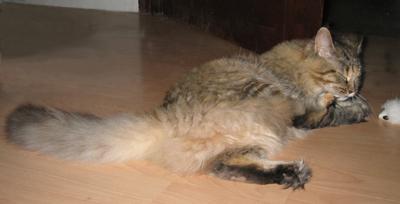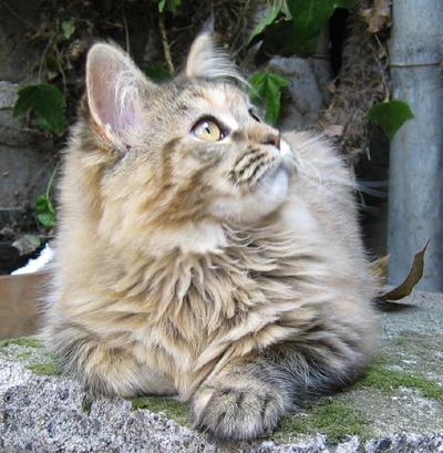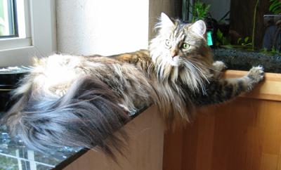 Lucy ist die einzige Katze, die ich kenne, die aus dem Stand auf meinen Schrank springt (ca. 2,40 hoch). Sie ist eine sehr schlanke und leichte aber super muskulöse Katze ... und Fell hat sie ... ein echtes “Zottelmonster”.