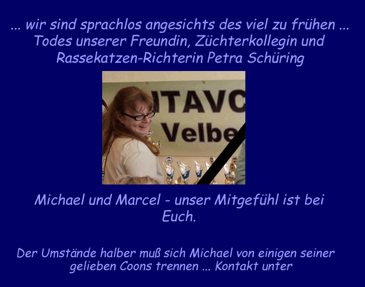 Weil die beiden Männer jetzt mit dem Hauhalt und den Tieren alleine sind - müssen sie sich Zähne-knirschend von einigen Tieren trennen. Ihr Lieben, wenn Sie eine Maine Coon vom "alten Schrot und Korn" möchten, bitte ich sie zuerst bei Herrn Melcher und den Metal Coons vorbeizuschauen (Michael-Melcher@web.de und Telefon 02162 - 268 377). Es gibt dort stattliche Kater und bunte Mädchen, wie Prinzessinen, eine süßer als die Nächste. Lieber Michael, lieber Marcel, wir alle nehmen herzlich Anteil an Eurem Verlust der Mutter und Partnerin - an dieser Stelle bedanken wir uns, daß es Petra mit ihrer sonnigen und optimistischen Art für uns alle gegeben hat; sie hatte immer ein liebes Wort für jeden von uns ...
