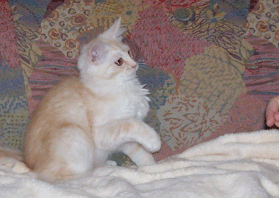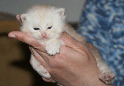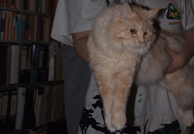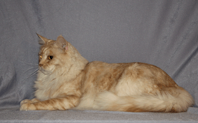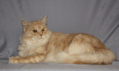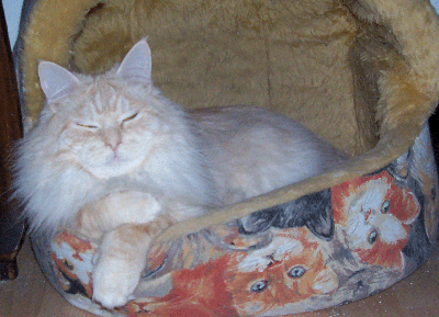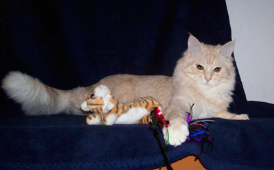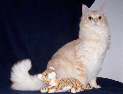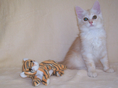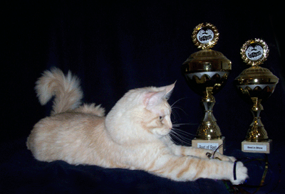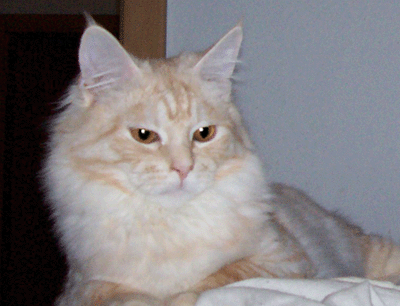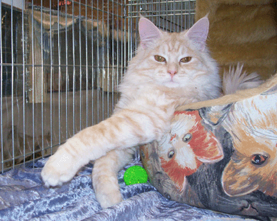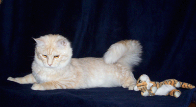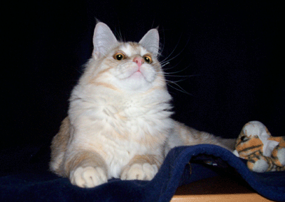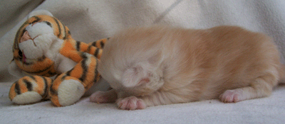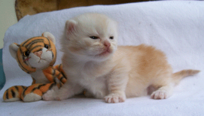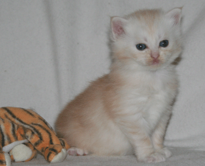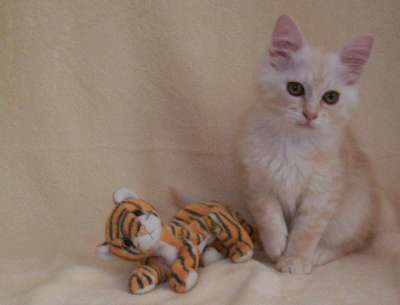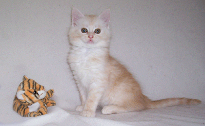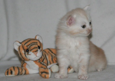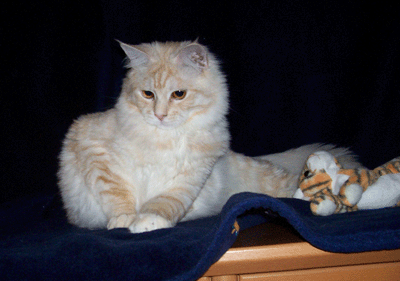 Tiger ist ein Kater, der bei der Geburt auf red smoke bestimmt wurde, jetzt ist er jedoch soweit aufgehellt, daß er auf (hot) creme smoke umbestimmt werden mußte.