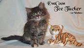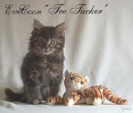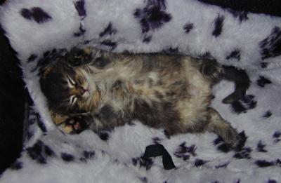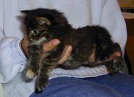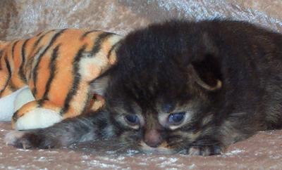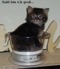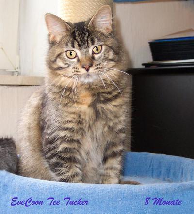 Die ersten 3 Wochen seines Lebens hat Tucker als Mädchen verbracht. Als aber sein Vater Sam eines “seiner Mädchen” anders - irgendwie grober - behandelte, wurde ich stutzig ... also gucken was der kleinen Motte fehlt ... nichts, nur irgendwie seltsame Farbe auch für ein Mäd..., hä, ein Junge !?! Na, damit hatten wir nicht gerechnet! Also Donnerstags Geschlechtsbestimmung beim Tierarzt, Freitags Farbbestimmung beim Verein ... fertig war die Überraschung: ein Torbie-Kater ... welch ein großes Glück!