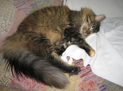 Nun, und dann wurde aus meinem Tuckerli doch noch ein Maine Coon. Die Kater-Gewichtsklasse hat er nie erreicht, war aber mit fast 7 Kilo nicht schlecht dabei. Später nahm er aber wieder ab. Das hohe Gewicht tat seinen Knochen nicht gut.