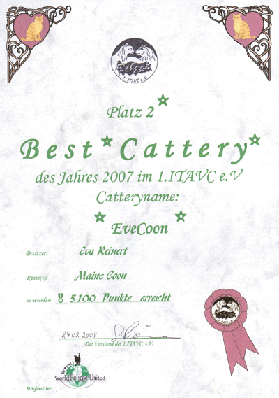 Der 1. ITAVC e.V., Velbert, hatte im Jahr 2007 650 Vollmitglieder, davon 85 % Züchter. Diese Auszeichnung besagt, daß meine Tiere auf Ausstellungen regelmäßig so erfolgreich waren, daß sie insgesamt der 2.- erfolgreichste Zwinger innerhalb des 1. ITAVC für das Jahr 2007 sind. 2008 wurde es Platz 4, 2009 Platz 9 ...